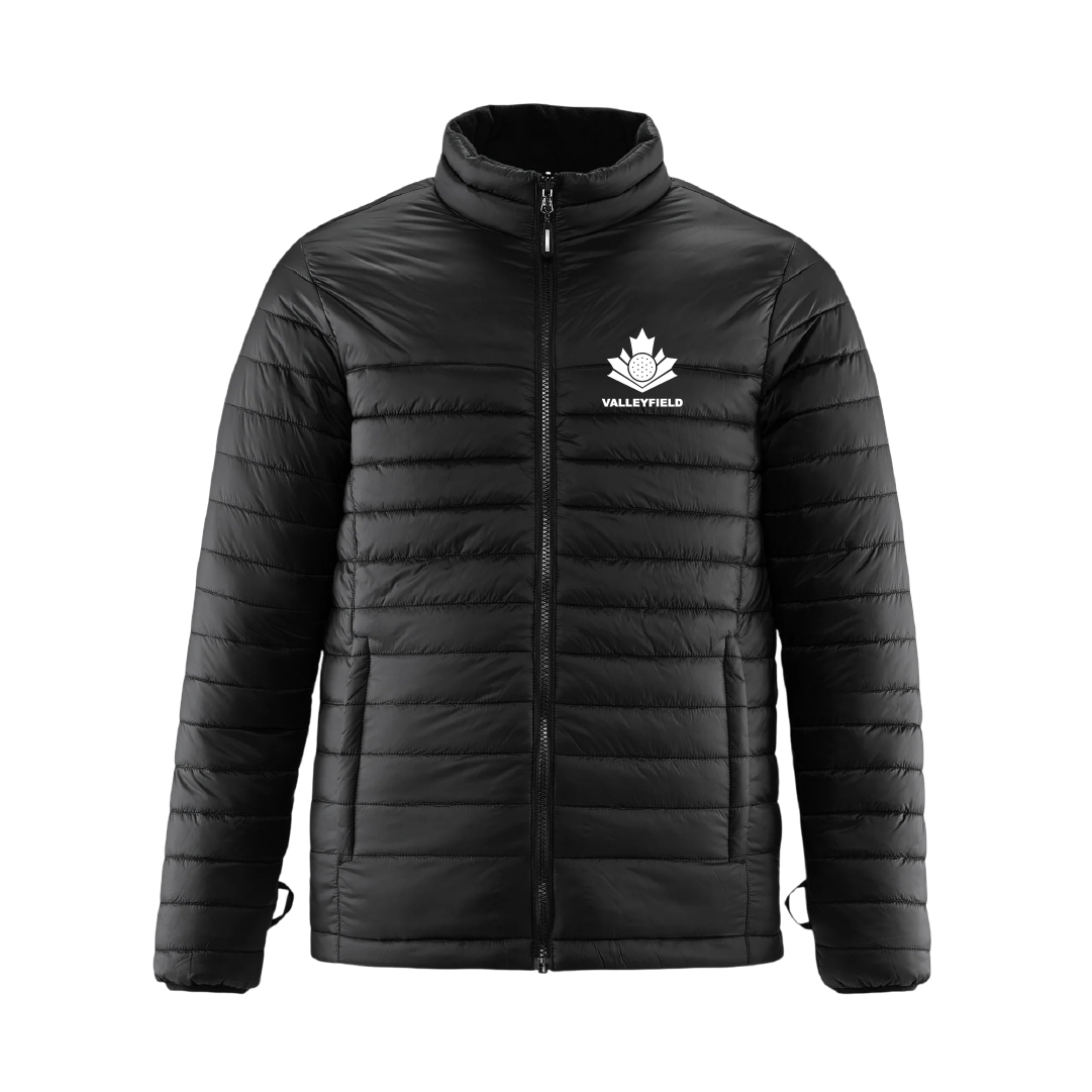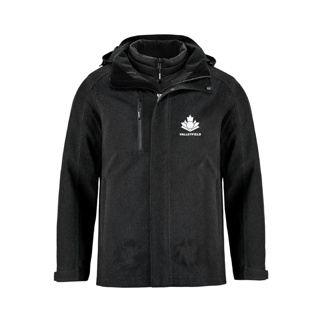 Ce manteau 3-en-1 combine une coquille extérieure en polyester recyclé imperméable et coupe-vent avec une veste intérieure matelassée amovible avec le logo est brodé sur les deux couches. Il possède une capuche détachable avec cordon ajustable, poches zippées extérieures et intérieures, poignets et ourlet ajustables, avec doublure en taffetas embossé et fermetures éclair YKK. Les matériaux sont respirants, déperlants et sans PFC, offrant confort, protection et durabilité.